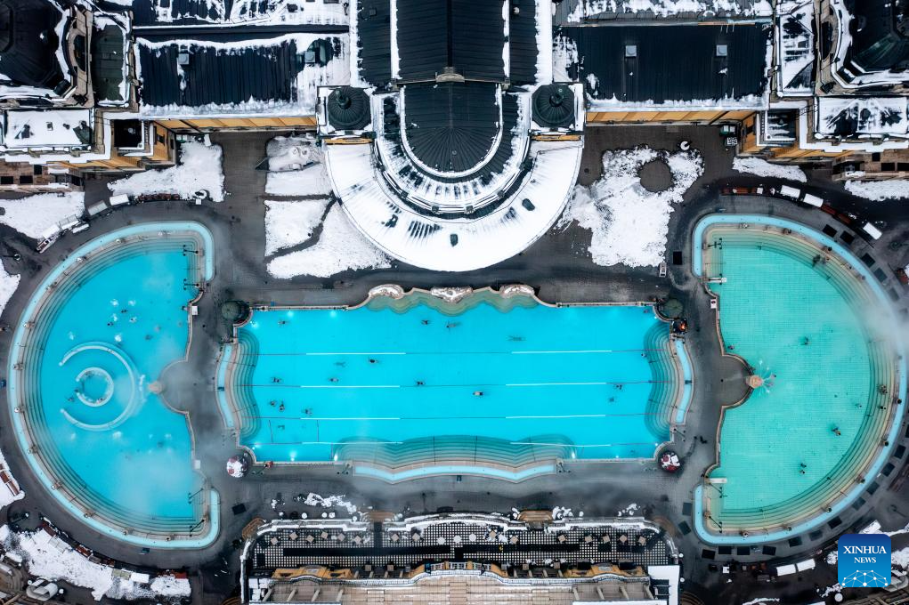 BUDAPEST, 16 enero, 2026 (Xinhua) -- Vista aérea tomada con un dron el 16 de enero de 2026 del Balneario Termal Szechenyi cubierto de nieve, en Budapest, Hungría.…