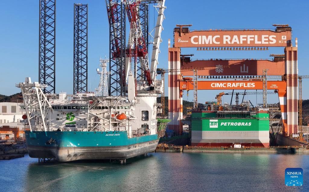 JINAN, 28 diciembre, 2025 (Xinhua) -- Vista aérea tomada con un dron el 24 de diciembre de 2025 del equipo de ingeniería marina realizando trabajos de construcción en la base de CIMC Raffles, en Yantai, en la provincia de Shandong, en el este de China.…