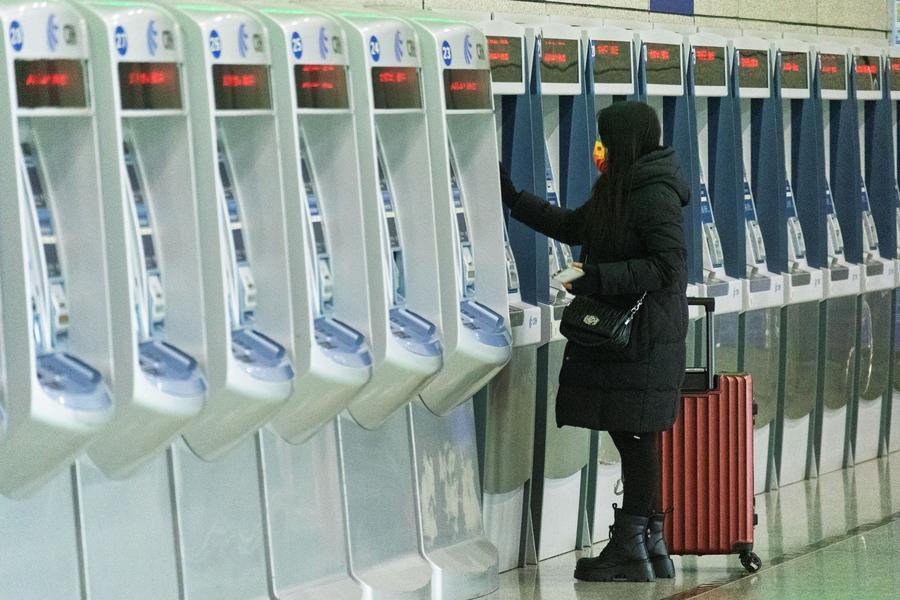 Una pasajera compra boletos de tren en una estación de ferrocarriles, en Nanjing, en la provincia de Jiangsu, en el este de China, el 19 de enero de 2026.…