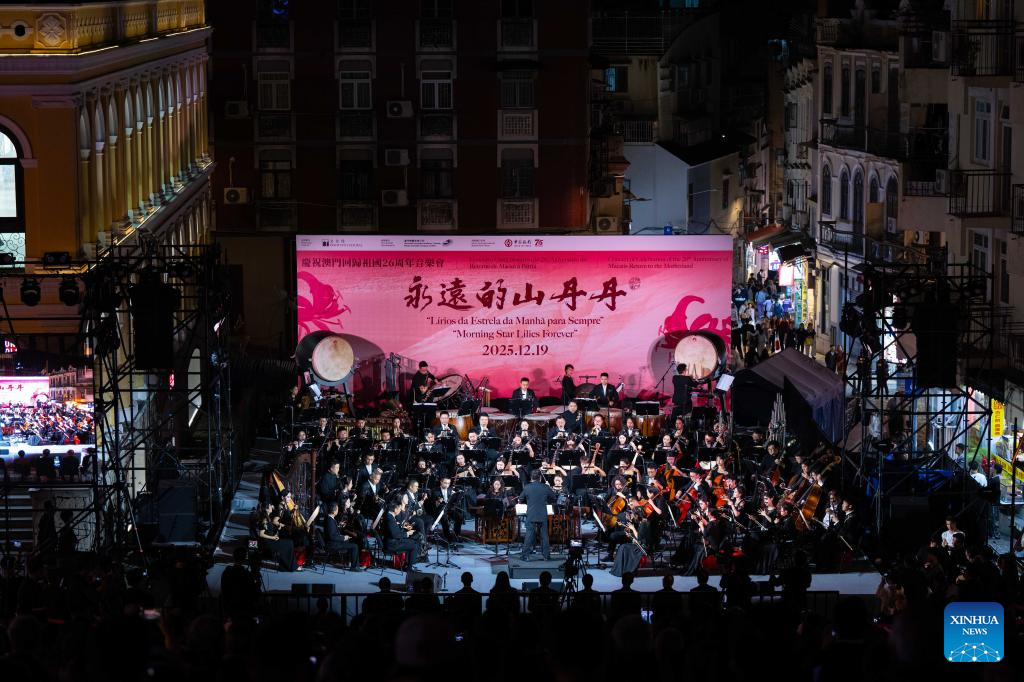 MACAO, 19 diciembre, 2025 (Xinhua) -- Imagen del 19 de diciembre de 2025 de un concierto para celebrar el 26º aniversario del regreso de Macao a la madre patria, en Macao, en el sur de China.…