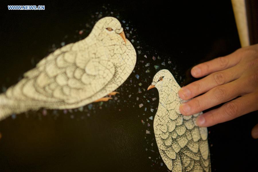 Nanchang,19/01/2016(El Pueblo en Línea)- Hu Wei, artista de la pintura de laca muestra figuras de palomas que construyó con cáscaras de huevo. La pintura de laca ha sido utilizada desde la Dinastía Shang (1384-1111 a.C.) para decorar y preservar objetos de madera. En la Dinastía Han el decorado se volvió más intrincado. Este arte a veces es usado para decorar objetos de madera, como las cajas de dulces o mesas de laca, ambos objetos tradicionales chinos.