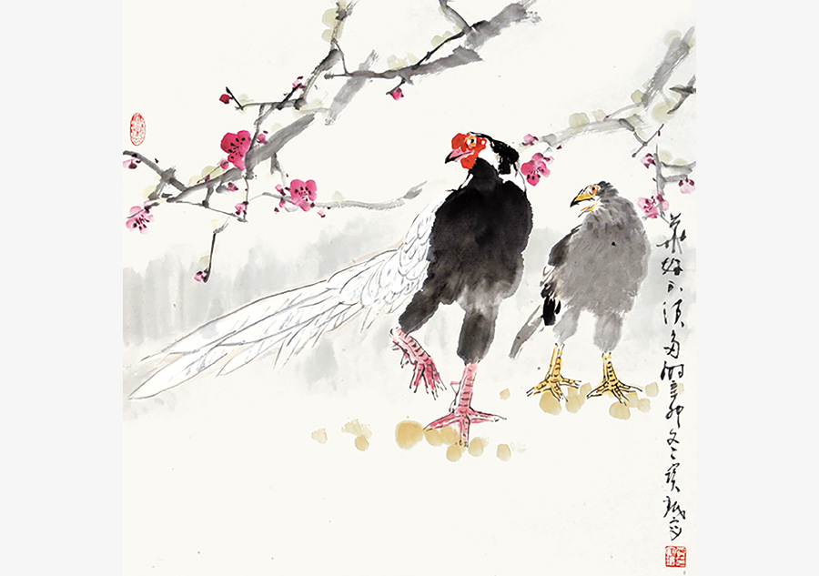 Obra de Jia Baomin realizada en tinta tradicional con temática de aves y flores. [Foto: Proporcionada]