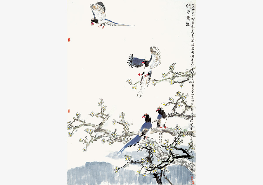 Obra de Jia Baomin realizada en tinta tradicional con temática de aves y flores. [Foto: Proporcionada]