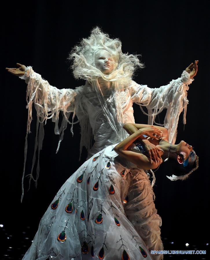 La maestra de baile china Yang Liping (abajo), participa en su drama de danza "Pavo Real de Invierno", en Kunming, capital de la provincia de Yunnan, en el suroeste de China, el 16 de noviembre de 2016. (Xinhua/Lin Yiguang)