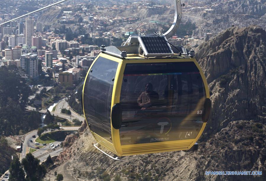 Imagen del 9 de octubre de 2014, de una mujer viajando a bordo de un teleférico en la ciudad de La Paz, Bolivia. (Xinhua/David de la Paz)