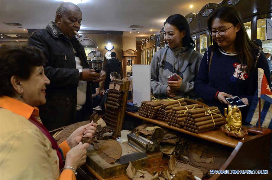 Imagen del 15 de enero de 2018 de Yolanda Medina (i) trabajando en la confección de puros habanos Premium mientras conversa con personas, en la Casa del Habano del Hotel Meliá Habana, en La Habana, Cuba. Yolanda Medina acaba de regresar por enésima vez a Cuba de China, donde estuvo en las ciudades de Beijing y Shanghai para mostrar cómo se confeccionan los puros habanos Premium, que son los elaborados a mano. Cada año, desde hace 17, hace un viaje a esas ciudades chinas para laborar durante tres meses en el creciente mercado de la compañía Habanos S.A., una empresa mixta entre la estatal Cubatabaco y Altadis, filial franco-alemana de la multinacional británica Imperial Tobacco. El resto del año, Yolanda trabaja cada día en la Casa del Habano del Hotel Meliá Habana, una lujosa institución donde se pueden adquirir los más exclusivos y aristocráticos puros cubanos. Medina es considerada hoy en día a nivel internacional como una de las mejores maestras torcedoras, de un selecto grupo de mujeres que ha alcanzado un alto grado de maestría en la complicada elaboración de los habanos. Los puros más difíciles de elaborar para Yolanda son los llamados "figurados", que son los que tienen ambas puntas finas o redondeadas, como los citados Diadema, así como los conocidos como Salomón y Pirámide. Yolanda entró en la lista de los Récords Guinnes con la confección del puro "fumable" más grande de la historia, que torció en la ciudad alemana de Stuttgart en 1984 y midió 1,26 metros. Años después, en 2016 superó esa marca al confeccionar otro de 2 metros como celebración del cumpleaños 90 del fallecido presidente cubano, Fidel Castro. A pesar de las dimensiones, esos dos habanos se consumieron en los labios de un afortunado fumador, a diferencia de los gigantescos puros elaborados por el también torcedor cubano José "Cueto" Castelar, quien confeccionó uno de 90 metros, igualmente por el cumpleaños de Castro. (Xinhua/Joaquín Hernández)