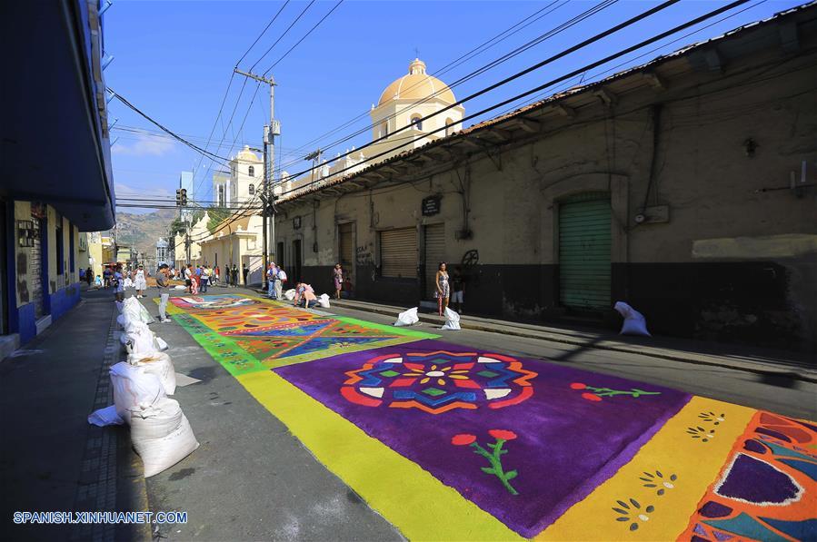 TEGUCIGALPA, marzo 30, 2018 (Xinhua) -- Personas se reúnen frente a alfombras de aserrín, en el marco de la conmemoración de Semana Santa, en Tegucigalpa, Honduras, el 30 de marzo de 2018. De acuerdo con información de la prensa local, trabajadores de la Alcaldía de Tegucigalpa, con ayuda de voluntarios, elaboraron alrededor de 900m de alfombras de aserrín como adorno de las procesiones de Semana Santa. (Xinhua/Rafael Ochoa)