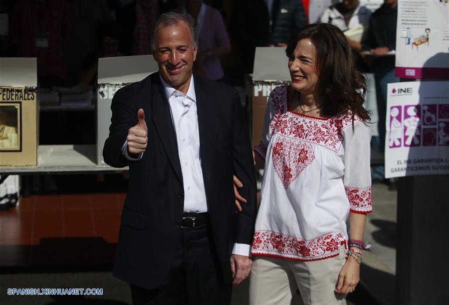El candidato a la Presidencia de México por la coalición "Todos por México", José Antonio Meade (i), en compañía de su esposa, Juana Cuevas (d), muestra su dedo entintado luego de emitir su voto durante las elecciones generales en un centro de votación, en la Ciudad de México, capital de México, el 1 de julio de 2018. Las autoridades electorales mexicanas dieron el domingo el banderazo de salida para la celebración de los comicios más grandes de la historia de México, en los cuales poco más de 89 millones de ciudadanos están habilitados para elegir a un nuevo presidente y a más de 3.400 cargos. (Xinhua/Ricardo Aldayturriaga)
