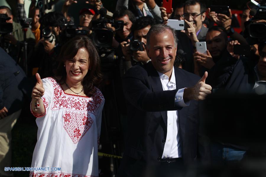 El candidato a la Presidencia de México por la coalición "Todos por México", José Antonio Meade (d), y su esposa, Juana Cuevas (i), reaccionan previo a emitir su voto durante las elecciones generales en un centro de votación, en la Ciudad de México, capital de México, el 1 de julio de 2018. Las autoridades electorales mexicanas dieron el domingo el banderazo de salida para la celebración de los comicios más grandes de la historia de México, en los cuales poco más de 89 millones de ciudadanos están habilitados para elegir a un nuevo presidente y a más de 3.400 cargos. (Xinhua/Ricardo Aldayturriaga)
