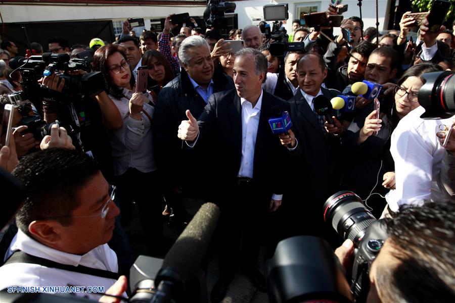 El candidato a la Presidencia de México por la coalición "Todos por México", José Antonio Meade (c), conversa con representantes de los medios de comunicación previo a emitir su voto durante las elecciones generales, en un centro de votación, en la Ciudad de México, capital de México, el 1 de julio de 2018. Las autoridades electorales mexicanas dieron el domingo el banderazo de salida para la celebración de los comicios más grandes de la historia de México, en los cuales poco más de 89 millones de ciudadanos están habilitados para elegir a un nuevo presidente y a más de 3.400 cargos. (Xinhua/Ricardo Aldayturriaga)