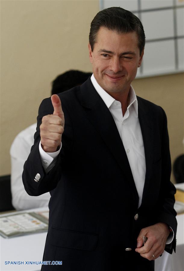 El presidente de México, Enrique Peña Nieto, muestra su dedo entintado después de emitir su voto durante las elecciones generales en un centro electoral en la Ciudad de México, capital de México, el 1 de julio de 2018. Las autoridades electorales mexicanas dieron el domingo el banderazo de salida para la celebración de los comicios más grandes de la historia de México, en los cuales poco más de 89 millones de ciudadanos están habilitados para elegir a un nuevo presidente y a más de 3,400 cargos. (Xinhua/Ricardo Aldayturriaga)