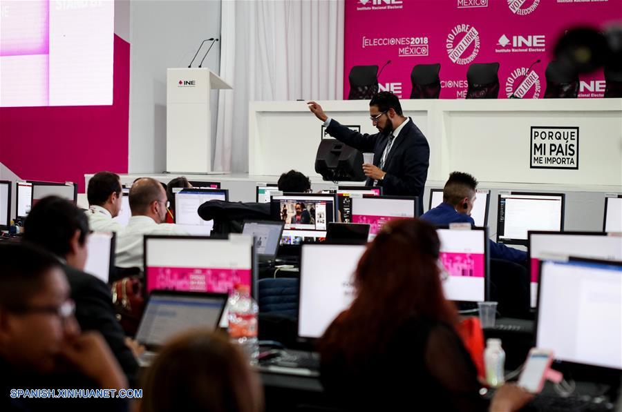 Empleados trabajan en la Macro Sala de Prensa del Instituto Nacional Electoral (INE), en la Ciudad de México, capital de México, el 1 de julio de 2018. De acuerdo con información de la prensa local, la Macro Sala de Prensa del INE, con una capacidad para atender a 600 medios de comunicación, fue inaugurada el miércoles 27 de junio de 2018, y dará servicio durante 10 días. (Xinhua/Francisco Cañedo)