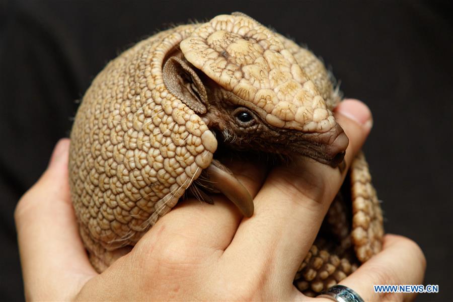 Un armadillo de tres bandas (tolypeutes matacus) nacido a finales de mayo en el Zoológico de Budapest, Hungría, el 21 de julio de 2018. (Xinhua / Szilard Voros)