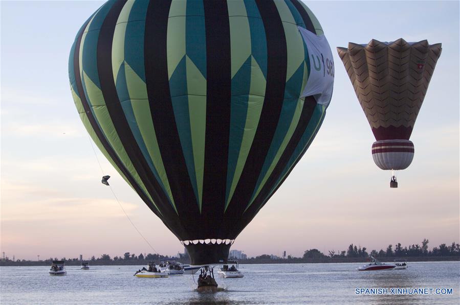 Un globo aerostático se posa sobre el agua durante la XVII edición del Festival Internacional del Globo (FIG), en la ciudad de León, estado de Guanajuato, México, el 17 de noviembre de 2018. El FIG se inauguró el viernes en el Parque Metropolitano con la participación de 200 globos de 23 países. El festival, que se lleva a cabo del 16 al 19 de noviembre, fue reconocido este año por la Secretaría de México con el premio de Diversificación del Producto Turístico 2018 y Desarrollo de Turismo en Espacios Públicos. (Xinhua/David de la Paz)
