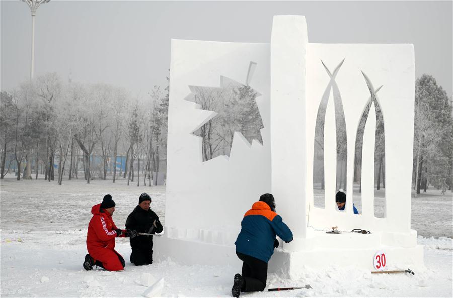 HARBIN, enero 13, 2019 (Xinhua) -- Participantes trabajan en una escultura de hielo durante la 24 Competencia Internacional de Esculturas de Nieve de Harbin en el Parque Internacional de Exposiciones de Arte de Escultura de Nieve Isla del Sol, en Harbin, capital de la provincia de Heilongjiang, en el noreste de China, el 13 de enero de 2019. La competencia terminó el domingo. (Xinhua/Wang Jianwei)