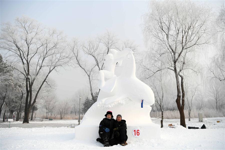 HARBIN, enero 13, 2019 (Xinhua) -- Participantes posan frente a una escultura de hielo durante la 24 Competencia Internacional de Esculturas de Nieve de Harbin en el Parque Internacional de Exposiciones de Arte de Escultura de Nieve Isla del Sol, en Harbin, capital de la provincia de Heilongjiang, en el noreste de China, el 13 de enero de 2019. La competencia terminó el domingo. (Xinhua/Wang Jianwei)