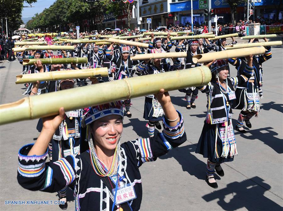 YUNNAN, febrero 7, 2019 (Xinhua) -- Personas participan en una danza de poste de bambú durante un desfile en el Condado Autónomo Lahu de Lancang en la ciudad de Pu'er, provincia de Yunnan, en el suroeste de China, el 7 de febrero de 2019. Las personas de grupos étnicos portando sus trajes festivos tradicionales participaron en un desfile para celebrar el Año Nuevo Lunar chino en el Condado Autónomo Lahu de Lancang. (Xinhua/Yang Zongyou)