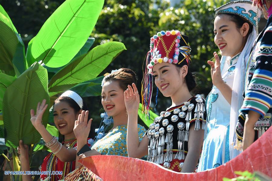 YUNNAN, febrero 7, 2019 (Xinhua) -- Mujeres saludan durante un desfile en el Condado Autónomo Lahu de Lancang en la ciudad de Pu'er, provincia de Yunnan, en el suroeste de China, el 7 de febrero de 2019. Las personas de grupos étnicos portando sus trajes festivos tradicionales participaron en un desfile para celebrar el Año Nuevo Lunar chino en el Condado Autónomo Lahu de Lancang. (Xinhua/Yang Zongyou)