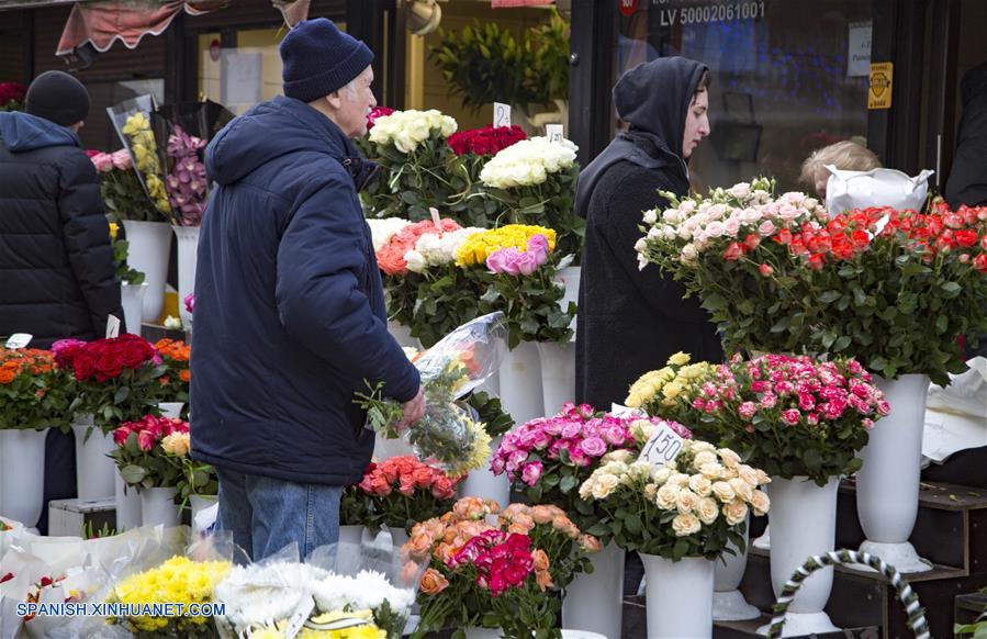 RIGA, 8 marzo, 2019 (Xinhua) -- Personas compran flores en ocasión del Día Internacional de la Mujer en el Mercado Central de Riga, en Riga, Letonia, el 8 de marzo de 2019. (Xinhua/Edijs Palens)