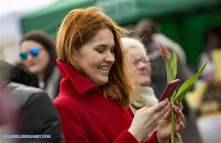 RIGA, 8 marzo, 2019 (Xinhua) -- Una mujer sostiene un tulipán en ocasión del Día Internacional de la Mujer en el Mercado Central de Riga, en Riga, Letonia, el 8 de marzo de 2019. (Xinhua/Edijs Palens)