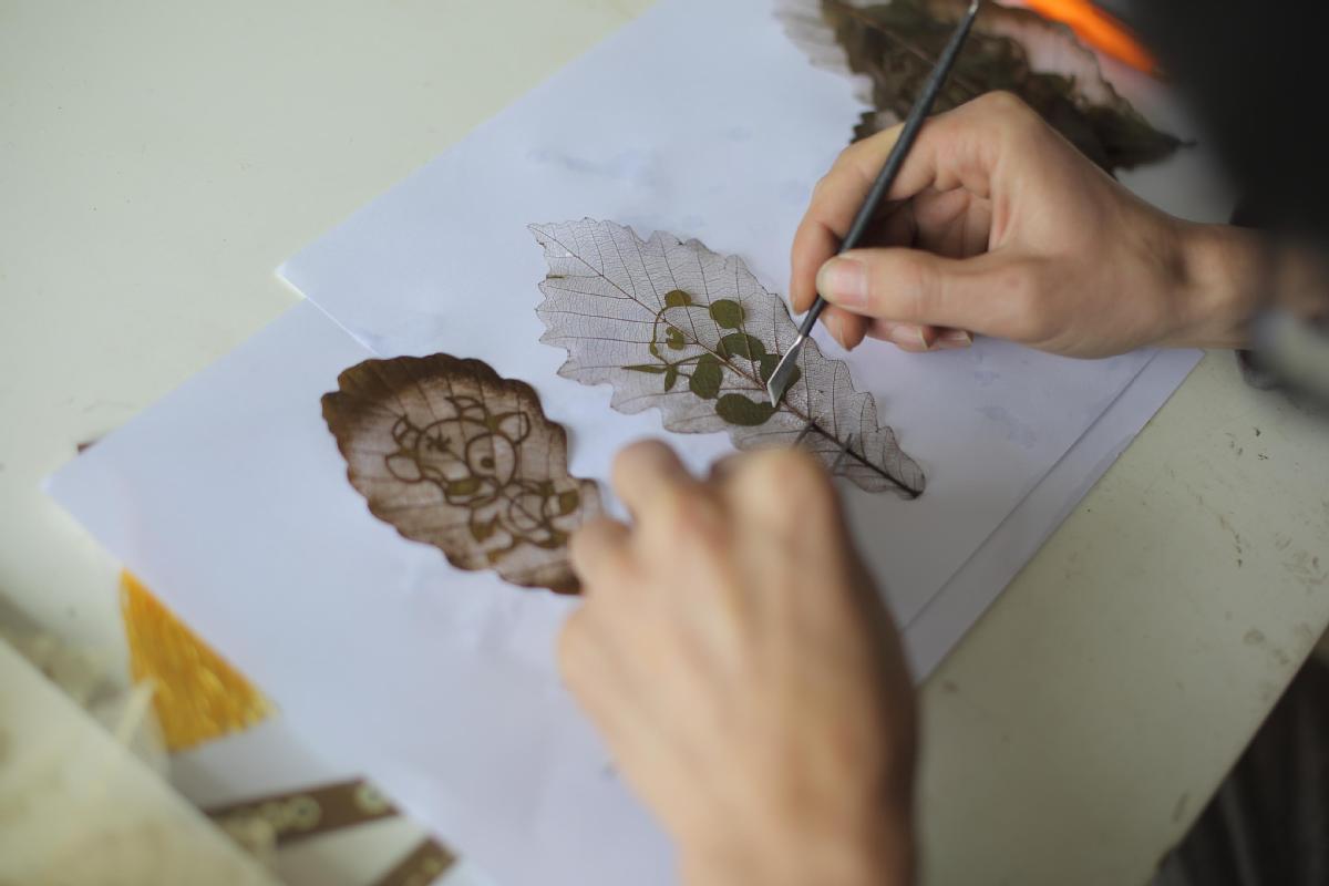 Deng Weiwei trabaja en una “pieza orgánica”. El calado chino en hojas de árboles realizadas por Deng Weiwei logró atraer la atención durante la reciente Feria Internacional de Artesanía de Florencia, Italia. [Foto: proporcionada a chinadaily.com.cn]