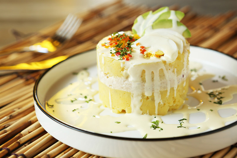 La causa de atún es un excelente ejemplo de Bachiche, que utiliza patata rallada para hacer un pastel con relleno de atún, cubierto con cilantro, mayonesa, huevo, cebolla y aguacate.