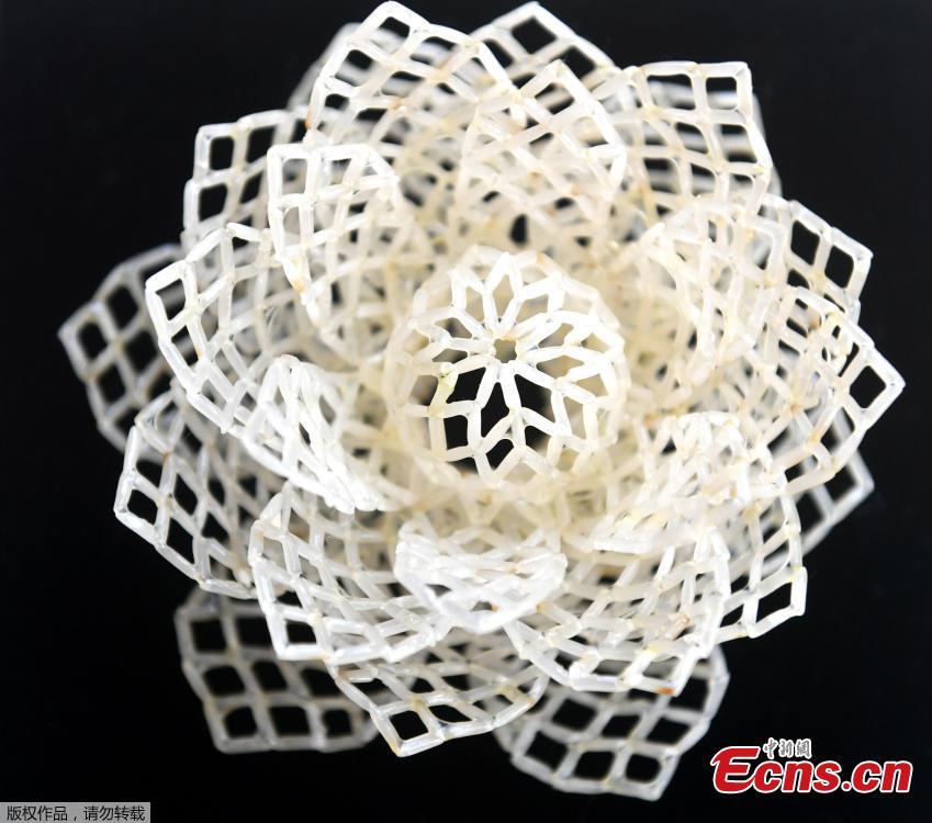 Una de las obras realizadas por Chen Guorui hecha con pequeños granos de arroz en la ciudad de Fuzhou, provincia de Fujian, este de China. De nombre gaoloumixian, que literalmente significa edificios altos hechos con granos de arroz, esta forma de arte se remonta al final de la dinastía Qing (1644-1911), y vivió su época de gran prosperidad durante el período Minguo (1912-49). Estas obras de arte se utilizaban para adorar a los antepasados y rezar por buenas cosechas. (Foto: Servicio de Noticias de China / Lu Ming)