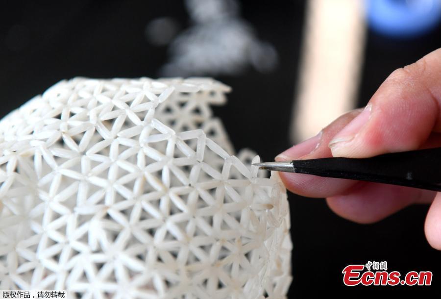 Fuzhou, 03/08/2020 (El Pueblo en Línea) -Chen Guorui utiliza pequeños granos de arroz para crear sus obras de arte en la ciudad de Fuzhou, provincia de Fujian, este de China. De nombre gaoloumixian, que literalmente significa edificios altos hechos con granos de arroz, esta forma de arte se remonta al final de la dinastía Qing (1644-1911), y vivió su época de gran prosperidad durante el período Minguo (1912-49). Estas obras de arte se utilizaban para adorar a los antepasados y rezar por buenas cosechas. (Foto: Servicio de Noticias de China / Lu Ming)