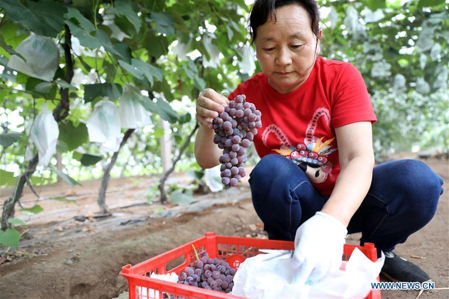 Un trabajador coloca uvas en una canasta en el viñedo Anshan Lyutaijia en la aldea Guoziyuan de Tangjiafang, ciudad de Anshan, provincia nororiental china de Liaoning. El viñedo Anshan Lyutaijia se encuentra al pie de la montaña Qianshan. El viñedo riega las uvas con leche y tortas de soja fermentadas. La industria de la uva no solo ayuda a aumentar los ingresos de los aldeanos, sino que también atrae a una gran cantidad de turistas. (Xinhua / Yao Jianfeng)