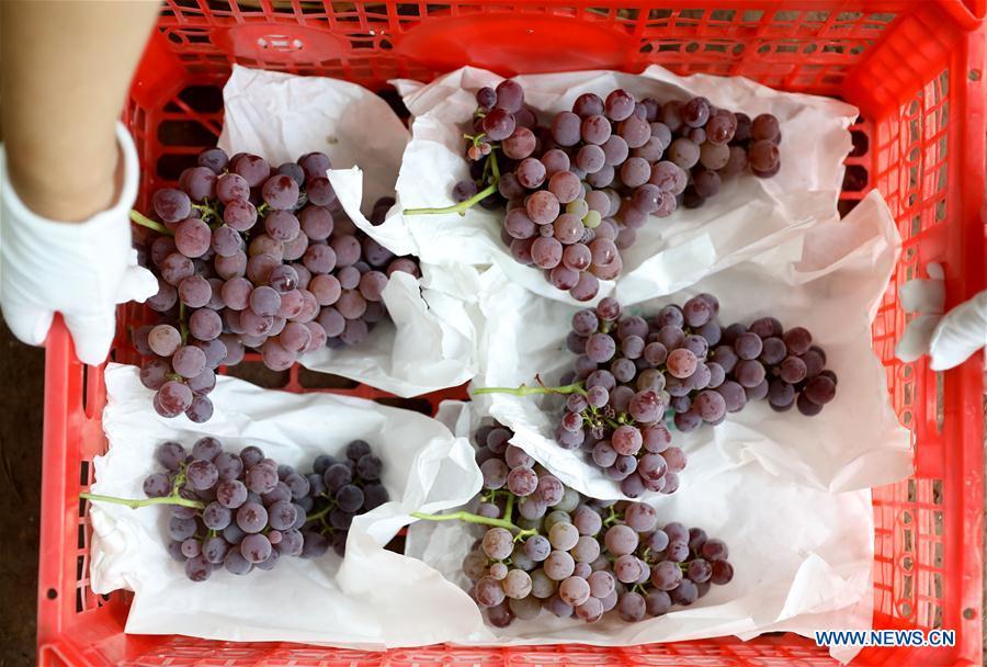 Anshan, provincia de Liaoning, 06/08/2020 (El Pueblo en Línea) -Foto del 4 de agosto de 2020 muestra uvas recién recolectadas en el viñedo Anshan Lyutaijia en la aldea Guoziyuan de Tangjiafang, ciudad de Anshan, provincia nororiental china de Liaoning. El viñedo Anshan Lyutaijia se encuentra al pie de la montaña Qianshan. El viñedo riega las uvas con leche y tortas de soja fermentadas. La industria de la uva no solo ayuda a aumentar los ingresos de los aldeanos, sino que también atrae a una gran cantidad de turistas. (Xinhua / Yao Jianfeng)