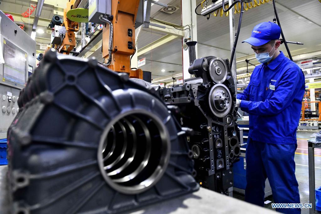 JINAN, 22 abril, 2021 (Xinhua) -- Un trabajador ensambla motores en una línea de ensamblaje en un taller de la compañía Weichai Power Co., Ltd. en la ciudad de Weifang, en la provincia de Shandong, en el este de China, el 22 de abril de 2021. La tecnología para la producción de motores de diésel de alta gama solía ser un cuello de botella para la industria manufacturera de equipamiento en China. Weichai Power Co., Ltd., una empresa estatal fundada en 1946, ha desarrollado el primer motor chino de alta velocidad y alta potencia con derechos de propiedad intelectual completamente independientes después de más diez años de la investigación científica y tecnológica, terminando por completo la dependencia de China en tecnologías extranjeras para vehículos comerciales pesados. En 2018, Weichai ganó el primer lugar del Premio de Progreso Científico y Tecnológico del Estado y se embarcó en un camino hacia el mercado internacional y el desarrollo de alta calidad. (Xinhua/Guo Xulei)