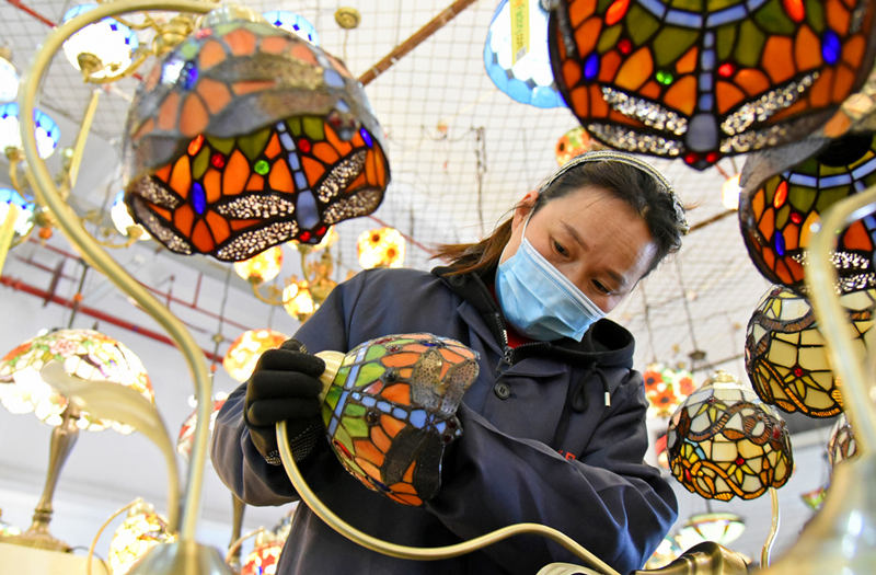 Trabajador monta lámparas de exportación en Lianyungang, provincia de Jiangsu. [Foto: Geng Yuhe/ China Daily]