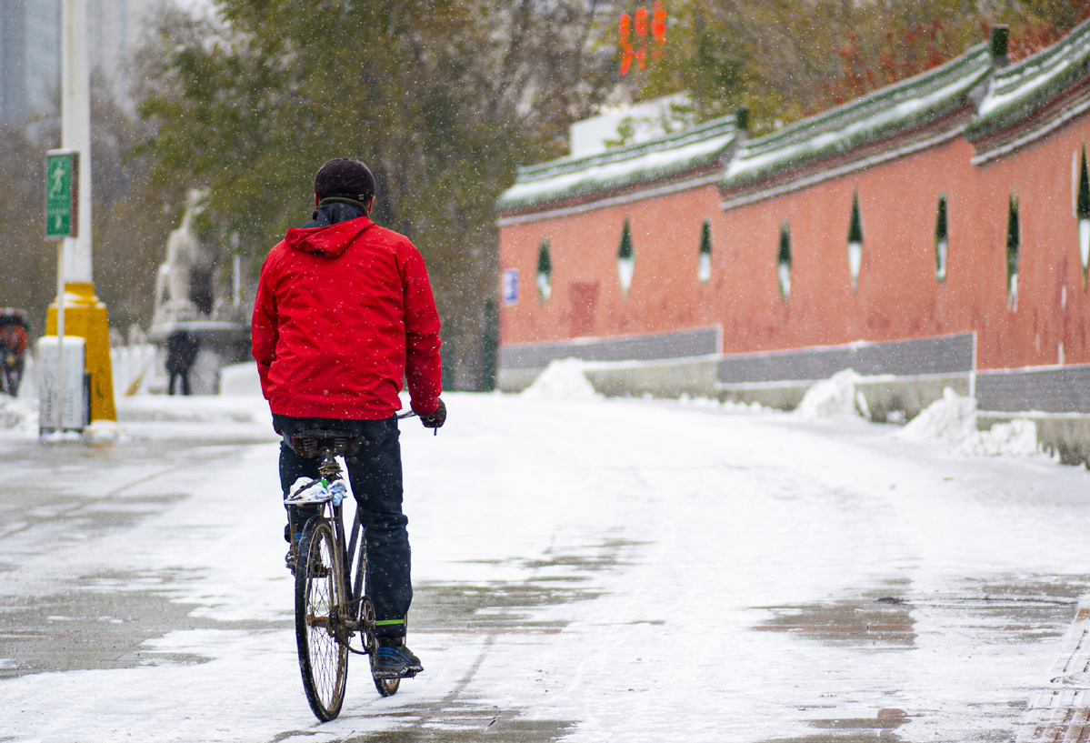 Un residente monta en bicicleta en Urumqi, región autónoma Uygur de Xinjiang después de una nevada el 4 de noviembre de 2021. [Foto / Xinhua]