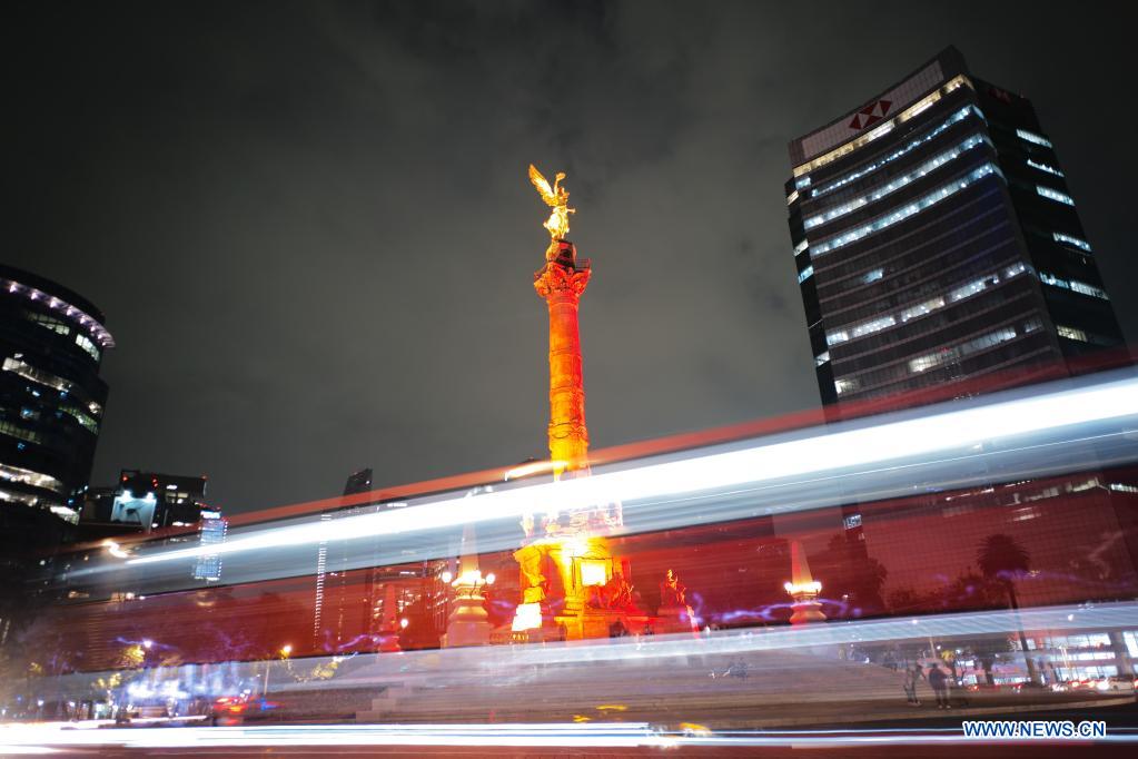 CIUDAD DE MEXICO, 15 febrero, 2022 (Xinhua) -- Imagen del 14 de febrero de 2022 del Angel de la Independencia iluminado de rojo para conmemorar el 50 aniversario del establecimiento de las relaciones diplomáticas entre China y México, en la Ciudad de México, capital de México. (Xinhua/Xin Yuewei)