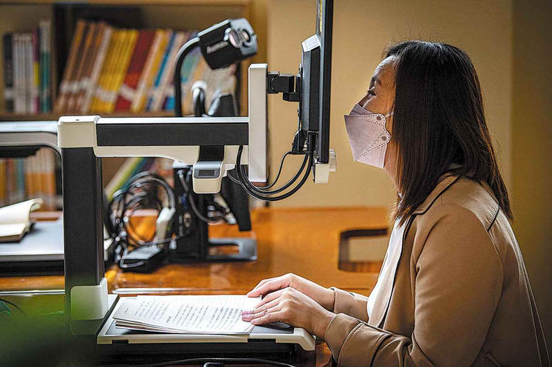 Wang Yufeng, que tiene discapacidad visual, lee con la ayuda de una máquina en un centro de rehabilitación en Yinchuan, región autónoma de Ningxia Hui, abril del 2022. (Foto: Feng Kaihua/ Xinhua)