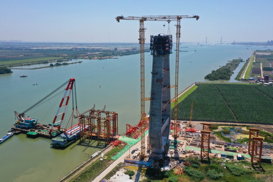 Vista aérea de la primera viga de caja de acero siendo instalada en el puente principal en la obra de construcción del puente de Hongqimen, provincia de Guangdong, sur de China, el 10 de abril de 2022. (Xinhua/Liu Dawei)