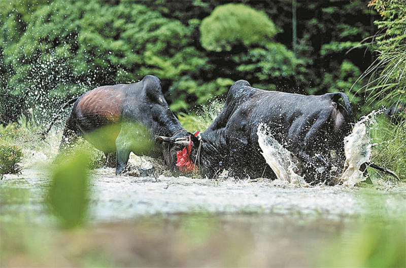 Los peces son el tema de las canciones populares, las danzas y las celebraciones de festivales en Qingtian, pero dos búfalos muestran que hay otros aspectos de la agricultura. [Foto: proporcionada a China Daily]