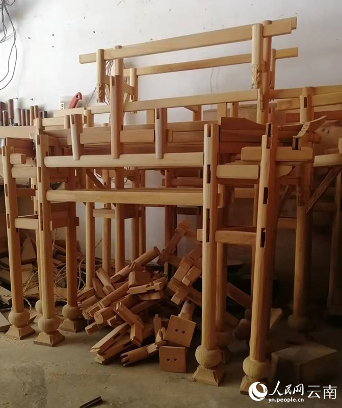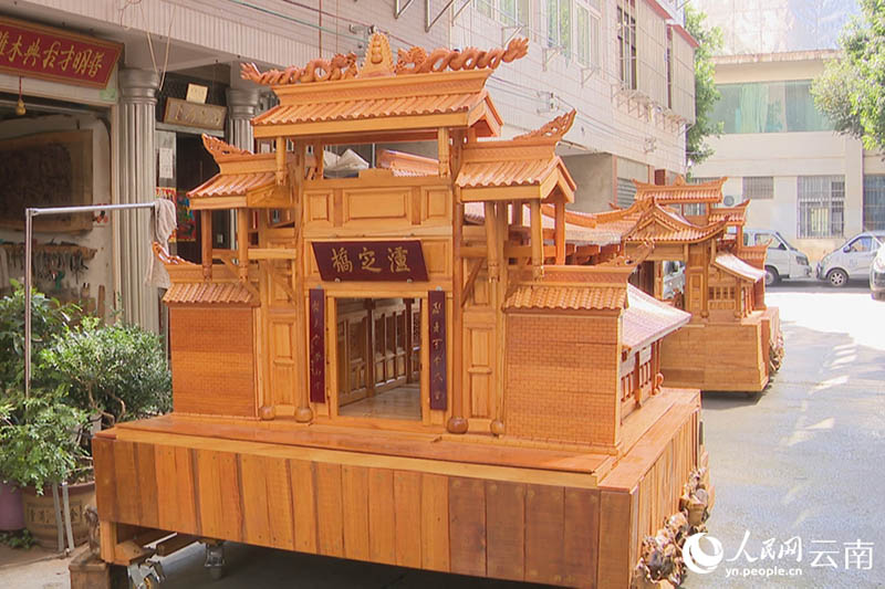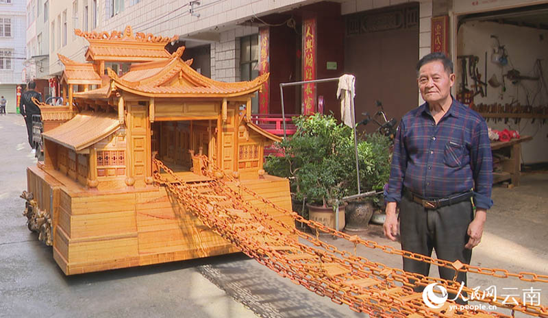 Utilizando una antigua técnica de carpintería, un antiguo escultor de madera de la ciudad de Yuxi, en la provincia de Yunnan, suroeste de China, ha creado un modelo de madera del Puente Luding de cadena de hierro, el lugar de una batalla crucial que cambió el curso de la historia del país.