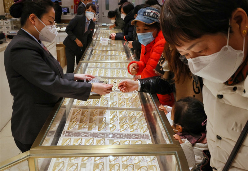 Clientes seleccionan joyas de oro en una tienda en Beijing, el 5 de enero de 2023. [Foto de Jiang Dong/chinadaily.com.cn]