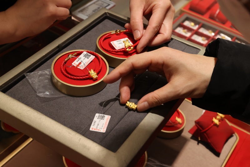 Clientes seleccionan joyas de oro con forma de conejo en una tienda en Beijing, el 5 de enero de 2023. [Foto de Jiang Dong/chinadaily.com.cn]