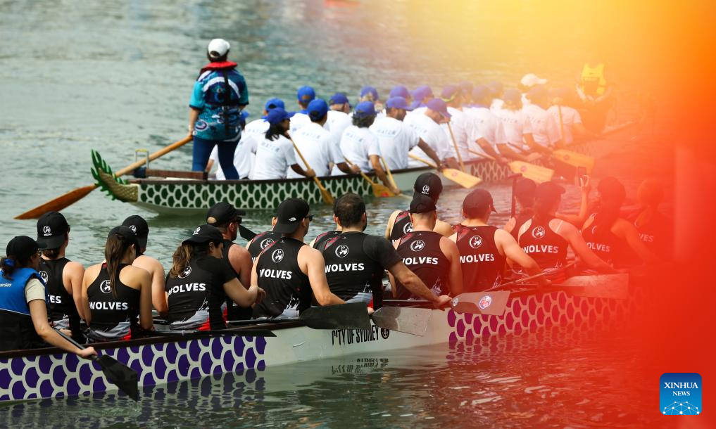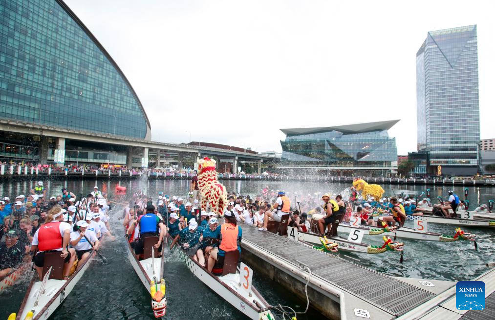 | SIDNEY, 17 febrero, 2024 (Xinhua) -- Imagen del 16 de febrero de 2024 de participantes compitiendo durante el Festival del Bote de Dragón del Año Nuevo Lunar de Sídney 2024 en el Puerto Darling, en Sídney, Australia. (Xinhua/Ma Ping)