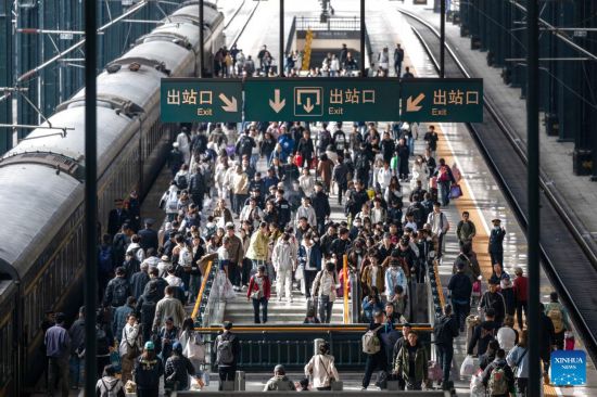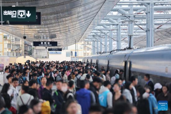BEIJING, 7 octubre, 2025 (Xinhua) -- Personas abordan un tren en la Estación del Ferrocarril de Kunming, en Kunming, en la provincia de Yunnan, en el suroeste de China, el 7 de octubre de 2025. A medida que las vacaciones del Día Nacional y el Festival de Medio Otoño llegan a su fin, los flujos de viajes de regreso aumentan en todo el país. (Xinhua/Yang Zixuan)