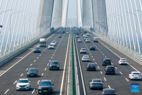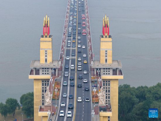 BEIJING, 7 octubre, 2025 (Xinhua) -- Imagen tomada con un dron el 7 de octubre de 2025 del flujo vehicular en el puente de Nanjing sobre el río Yangtse, en Nanjing, en la provincia de Jiangsu, en el este de China. A medida que las vacaciones del Día Nacional y el Festival de Medio Otoño llegan a su fin, los flujos de viajes de regreso aumentan en todo el país. (Xinhua/Yang Suping)