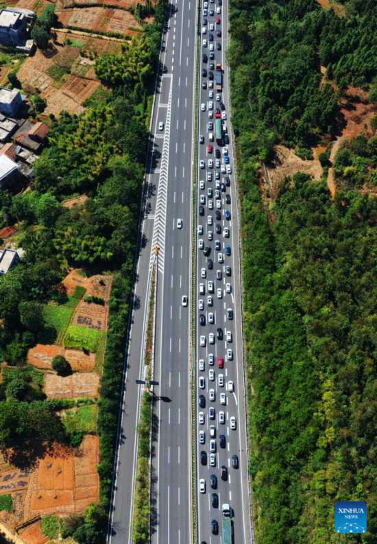 BEIJING, 7 octubre, 2025 (Xinhua) -- Imagen tomada con un dron el 7 de octubre de 2025 del flujo vehicular de una autopista, en Chenzhou, en la provincia de Hunan, en el centro de China. A medida que las vacaciones del Día Nacional y el Festival de Medio Otoño llegan a su fin, los flujos de viajes de regreso aumentan en todo el país. (Xinhua/Huang Chuntao)
