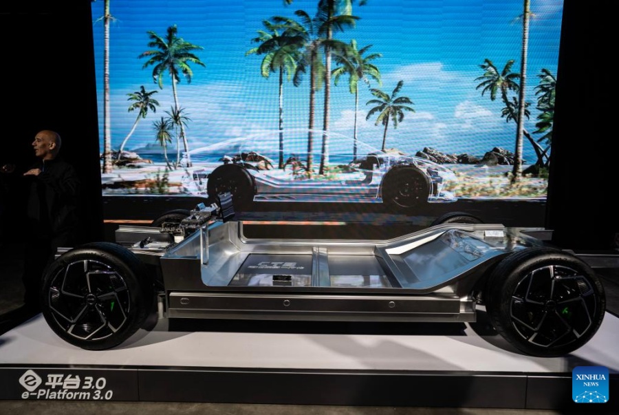 La "e-platform 3.0" para autos eléctricos de la compañía china de tecnología Build Your Dreams (BYD) es exhibida durante el evento de lanzamiento de modelos para el mercado argentino, en la ciudad de Buenos Aires, capital de Argentina, el 8 de octubre de 2025. Los autos eléctricos e híbridos del fabricante chino BYD desembarcaron oficialmente en Argentina tras un lanzamiento realizado el miércoles en la ciudad de Buenos Aires. (Xinhua/Martín Zabala)