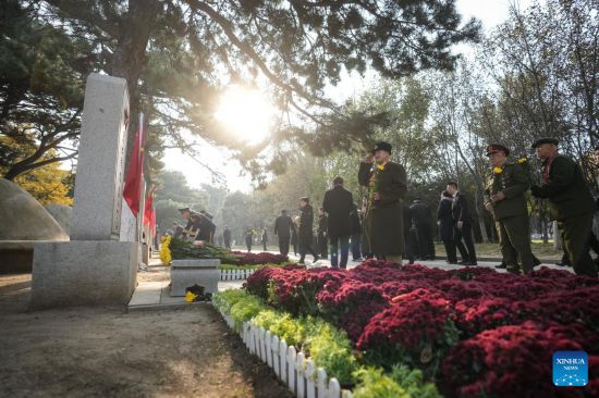 SHENYANG, 25 octubre, 2025 (Xinhua) -- Una ceremonia de presentación de cestas de flores se lleva a cabo en el cementerio de los mártires de los Voluntarios del Pueblo Chino (VPCh), en Shenyang, en la provincia de Liaoning, en el noreste de China, el 25 de octubre de 2025. La provincia de Liaoning realizó el sábado ceremonias de presentación de cestas de flores en Shenyang y Dandong para conmemorar el 75º aniversario del ingreso a la República Popular Democrática de Corea de los VPCh para luchar en la Guerra de Resistencia contra la Agresión de Estados Unidos y de Ayuda a Corea. (Xinhua/Pan Yulong)