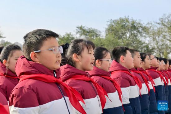 SHENYANG, 25 octubre, 2025 (Xinhua) -- Estudiantes entonan el himno nacional durante una ceremonia de presentación de cestas de flores en la torre conmemorativa en el Salón Conmemorativo de la Guerra de Resistencia contra la Agresión de Estados Unidos y de Ayuda a Corea, en Dandong, en la provincia de Liaoning, en el noreste de China, el 25 de octubre de 2025. La provincia de Liaoning realizó el sábado ceremonias de presentación de cestas de flores en Shenyang y Dandong para conmemorar el 75º aniversario del ingreso a la República Popular Democrática de Corea de los Voluntarios del Pueblo Chino (VPCh) para luchar en la Guerra de Resistencia contra la Agresión de Estados Unidos y de Ayuda a Corea. (Xinhua/Wu Qinghao)