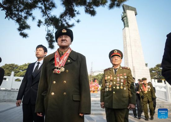 SHENYANG, 25 octubre, 2025 (Xinhua) -- Veteranos de los Voluntarios del Pueblo Chino (VPCh) presentan flores a los mártires de los VPCh en el cementerio de los mártires de los VPCh, en Shenyang, en la provincia de Liaoning, en el noreste de China, el 25 de octubre de 2025. La provincia de Liaoning realizó el sábado ceremonias de presentación de cestas de flores en Shenyang y Dandong para conmemorar el 75º aniversario del ingreso a la República Popular Democrática de Corea de los VPCh para luchar en la Guerra de Resistencia contra la Agresión de Estados Unidos y de Ayuda a Corea. (Xinhua/Pan Yulong)
