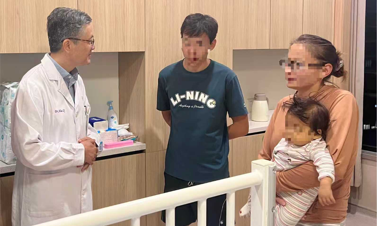 El doctor Xia Qiang pregunta sobre la situación de un niño lactante de seis meses de Mongolia que sufrió de atresia biliar. El niño se sometió a una cirugía de trasplante de hígado en el Hospital Renji, afiliado a la Escuela de Medicina de la Universidad Jiao Tong de Shanghai, el 30 de septiembre de 2025. (Foto: Cortesía)