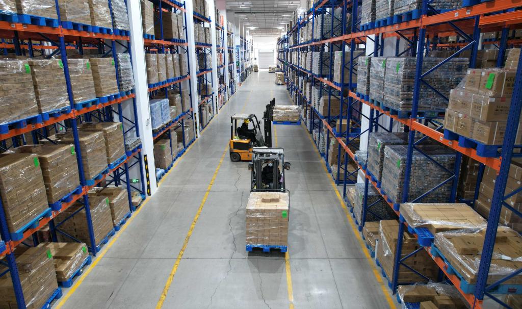 BEIJING, 10 noviembre, 2025 (Xinhua) -- Imagen tomada con un dron el 10 de noviembre de 2025 de trabajadores operando montacargas para trasladar paquetes en un parque logístico de alimentos para mascotas, en el poblado de Tongjing de la ciudad de Linyi, en la provincia de Shandong, en el este de China. Las compañías de comercio electrónico y logística a lo largo de China se encuentran ocupadas vendiendo, empaquetando y entregando mercancía en vísperas del festival anual de compras "Doble Once", que cae el 11 de noviembre. (Xinhua/Wang Yanbing)